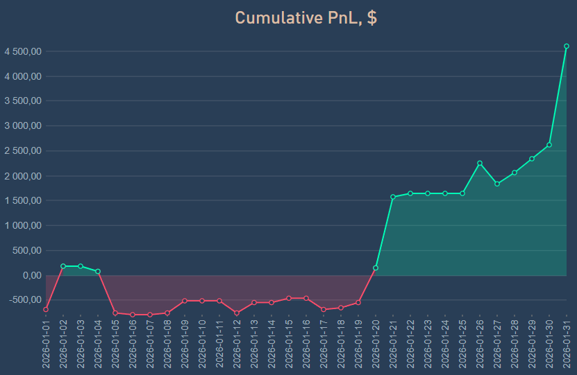 Přes všechny tyto turbulence dokázalo Algomoneo v lednu dosáhnout zisku 7,5 %. Tento výsledek jasně demonstruje schopnost společnosti Algomoneo rychle se přizpůsobit měnícím se tržním podmínkám a efektivně využít příležitosti, které se během měsíce naskytly. Díky strategickým rozhodnutím si Algomoneo nejen udrželo stabilní růst, ale také efektivně zvládlo výzvy, které přinesl turbulentní začátek roku.